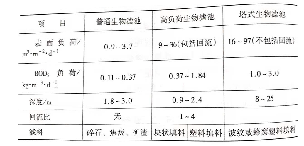常见的生物滤池有普通生物滤池、高负荷生物滤池和塔式生物滤池等三种,下面的表格列出了这三种生物滤池的基本参数。
